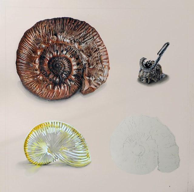 Anthropocene, Fossils from the Grenoble Muséum and their plastic artefacts, colored pencils, graphite, acrylic heightening,70 x 50 cm, 2020-2021